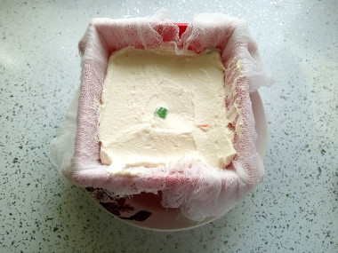 Приготовьте пасочницу. Если она разборная, то соберите её. Идеальна форма размером 12×12,5×5 см для 700 гр пасхи. Застелите форму чистой марлей или бинтом. Выложите внутрь подготовленную творожную массу, плотно утрамбовывая. Концы марли сложите внутрь. Форму с пасхой поставьте на блюдце или миску, чтобы в неё собиралась жидкость. Сверху на пасху установите груз (это может быть небольшая чашка с водой). Поставьте форму с пасхой в холодильник на 8-12 часов.