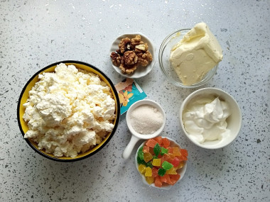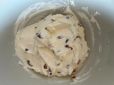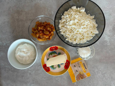 Изюм запарьте кипятком, затем воду слейте и промойте изюм. Смешайте в глубокой миске творог, измельчённые орехи, изюм, сметану и сливочное масло (его размягчите при комнатной температуре, предварительно достав из холодильника). Добавьте сахар и ванилин, всё тщательно перемешайте. Ванильный сахар можно заменить на ванилин. Как правильно это сделать читайте в отдельной статье по ссылке после рецепта.