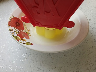 Я заменила изюм на цукаты, которые нарезала помельче. Орехи обжарила на сухой сковороде до приятного аромата и порубила ножом. Пасочницу выстлала влажной марлей и выложила в нее творожную массу. Концы сложила сверху, положила крышку от контейнера подходящего размера, а на нее установила банку весом 800 г. Саму пасочницу поставила в глубокую тарелку, в которую положила прослойку в виде формочки для печенья. До этого я недавно додумалась). Дело в том, что нижняя часть творога будет находиться в выделившейся сыворотке. А за счет формочки сыворотка будет стекать вниз и пасха не намочится. Вся эта конструкция стояла у меня в холодильнике сутки (из-за влажности творога).