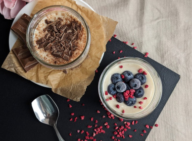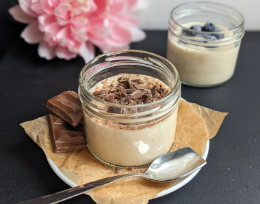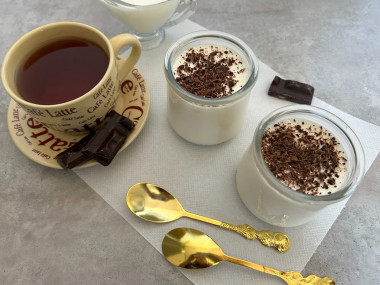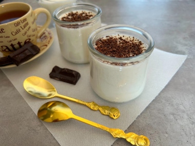 Приготовленную заготовку крема десерта в домашних условиях разложите по креманкам и отправьте в холодильник для застывания, достаточно пары часов. Выньте десерт из холодильника, сверху его можно присыпать тертым молочным или горьким шоколадом либо дробленными орехами. Подойдет к такому десерту и кофейный сироп. Конечно, такое лакомство получается довольно-таки калорийным, но зато вкусным, питательным и полезным. Приятного аппетита!