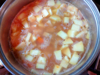 Затем отправить ко всем ингредиентам картофель и томатный соус(так же вместо соуса можно использовать одну столовую ложку томатной пасты). Всё перемешать и залить 1 л. кипятка. Количество воды можно регулировать на своё усмотрение, в зависимости от того, какой густоты Вы хотите получить суп. После закипания огонь убавить до среднего и варить до готовности картофеля(примерно 10-15 минут).