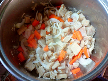 Говядины у меня не было, зато был говяжий рубец. С ним и варила суп. Перед тем, как использовать рубец непосредственно для супа, я три раза проварила его по 20 минут, после чего сливала воду, и потом варила его еще 2,5 часа. Нарезав вареный рубец на маленькие кусочки, я приступила к приготовлению супа. Готовила в соответствие с рекомендациями, указанными в рецепте.