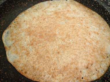 Затем переворачиваем и продолжаем жарить блин до румяности со второй стороны. По такому рецепту я выпекала блинчики первый раз и боялась, что отсутствие в составе теста яиц скажется на качестве теста и блинчиков из него. Но блинчики вполне хорошо отлипают от сковороды и не рвутся при переворачивании. Может быть, как правило, не получится первый блин, но последующие блины получились идеально тонкие и красивые.