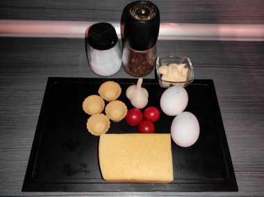 Обычно готовил тарталетки в более простом виде. Классические ингредиенты: сыр, чеснок и майонез. Увидел рецепт с вариантом украшения помидором и добавления яйца. Решил попробовать.