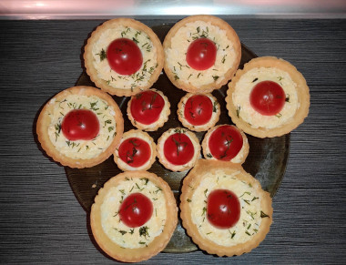 Купил тарталетки двух размеров - большие и поменьше. Украсил сверху укропом. На вид получилось очень интересно, тарталетки с помидорами и сыром выглядят очень ярко и аппетитно. По вкусу понравились тарталетки большего размера, т. к. сочетание ингредиентов более оптимальное, на мой вкус. В маленьких тарталетках помидор забирает на себя вкус сильнее, т. к. начинки в тарталетку влезает меньше. Спасибо за рецепт!