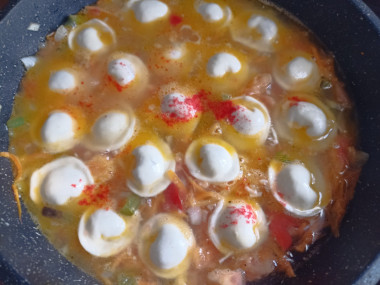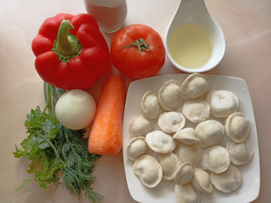Из рецепта можно исключить болгарский перец, а в конце приготовления пельмени посыпать тёртым сыром. Если вы используете домашние незамороженные пельмени, то время приготовления уменьшится до 7-8 минут.