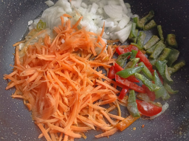 Морковь натереть на крупной тёрке или нарезать тонкими брусочками. Лук нарезать некрупно, а перец небольшими кубиками или соломкой, как Вам удобнее. На сковороде разогреть растительное масло и оправить нарезанные овощи пассероваться. Помешивая, готовить на сильном огне около трёх- пяти минут.