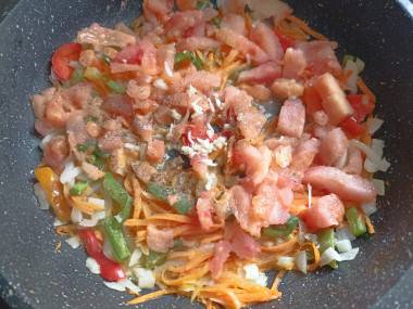Помидор нарезать кубиками. Предварительно с томата можно снять шкурку. Для этого залейте помидор кипятком, подержите около минуты затем воду слейте. Таким образом шкурку можно легко удалить. Чеснок нарубить максимально мелко, или можно пропустить через чеснокодавилку. Добавить в сковороду и на сильном огне готовить ещё три минуты. (Не забывайте периодически помешивать).