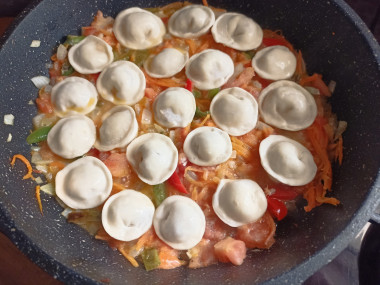 Обжаренные овощи посолить по вкусу. На данном этапе можно добавить любимые специи и приправы. Выложить замороженные пельмени одним слоем в сковородку не очень плотно друг к другу(так как по мере приготовления пельмени разбухают и могут слипнуться).
