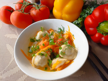 Заинтересовал рецепт пельменей с овощами на сковороде. Решила попробовать этот способ приготовления. Пельмени использовала домашние, замороженные. Получилось необычно и вкусно. Пельмешки, сваренные в овощном соусе зазвучали по-новому. Спасибо автору за рецепт!