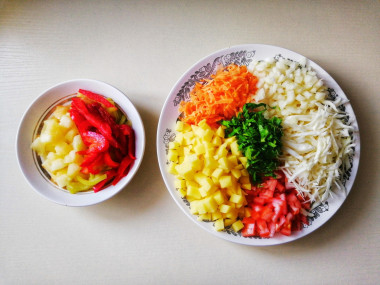 Натерла для супа морковь, нарезала капусту, лук, помидор, болгарский перец и кабачок (перец и кабачок у меня были замороженные). Сельдерей заменила петрушкой. От себя положила в суп несколько картошин.
