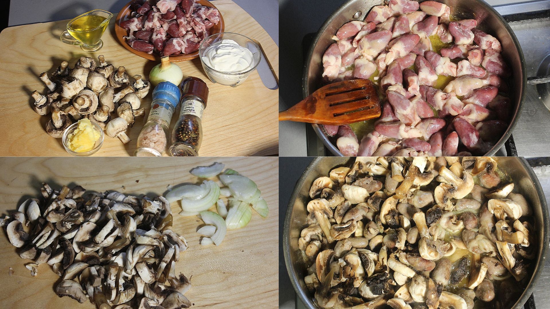 Калорийность продуктов: Куриные сердечки, Лук репчатый, Сливочное масло, Растительное масло, Сметана, Шампиньоны, Соль, Перец черный молотый