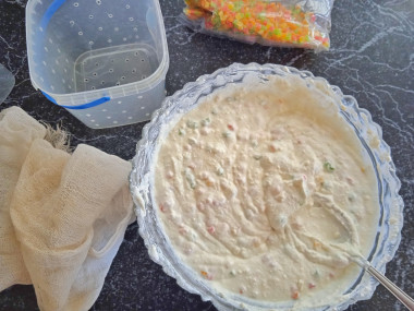 Импровизированную пасочницу выстелите двумя слоями влажной! плотной марли, чтобы края свисали. Максимально разровняйте марлю внутри стакана, чтобы узор на пасхе получился ровным.