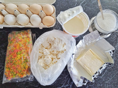 Калорийность продуктов: Творог, Сметана, Сахар, Ванильный сахар, Яичные желтки, Сливочное масло, Цукаты, Изюм, Грецкие орехи, Вода