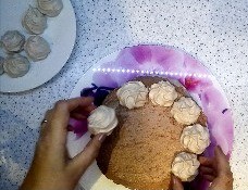 На верхний слой крема выложим по краям маленькие фигурные безе и в середину - вишню.