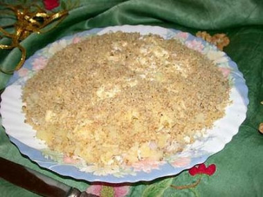 Последним слоем выложите сыр, натертый на терке. С готового салата снимите сервировочное кольцо. Верх салата можно украсить по своему вкусу.