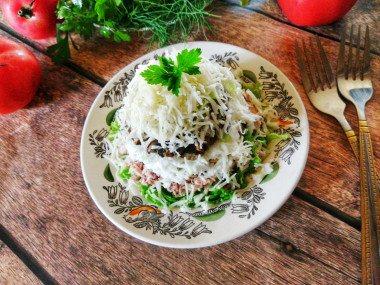Хрустящая пекинская капуста и болгарский перец добавили салату свежую нотку. Сочетание овощей с мясом, грибами и сыром мне понравилось. Особенно вкусным салат стал, когда настоялся и хорошо пропитался майонезом. Сьели его с удовольствием!