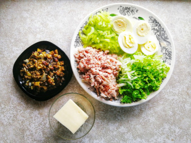 Простенький и миленький салатик. Спасибо автору. Из копченой курицы, шампиньонов, плавленым сыром попробуйте приготовить вот такой салат - Любимый муж. Вся семья будет рада.