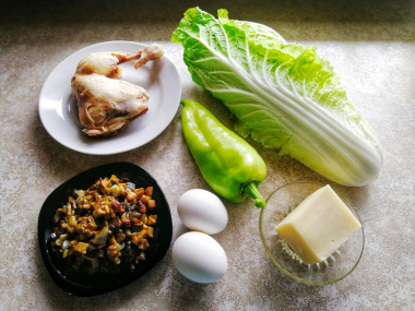 Куриное мясо нарежьте на мелкие кусочки и выложите следующим слоем на пекинскую капусту.