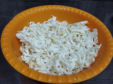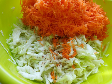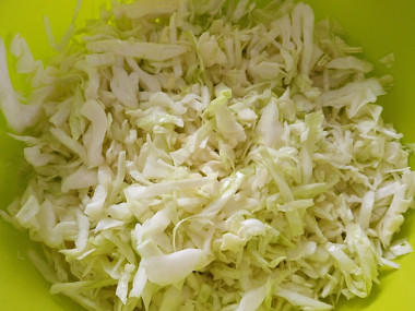 Капусту выложите в глубокую миску, в которой будет удобно перемешивать салат. Добавьте щепотку соли. Помните овощную нарезку чистыми руками чтобы капуста пустила сок.
