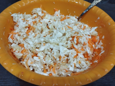 Нравятся быстрые,простые и вкусные салаты. И салат капуста с морковью и маслом не исключение. Приготовление занимает минимум времени,а результат всегда радует: сочно и очень вкусно! Капусту нашинковала и слегка помяла руками, морковь натерла на крупной тёрке. Посолила, немного поперчила, добавила масло и перемешала. От себя ещё добавила измельчённую зелень укропа.