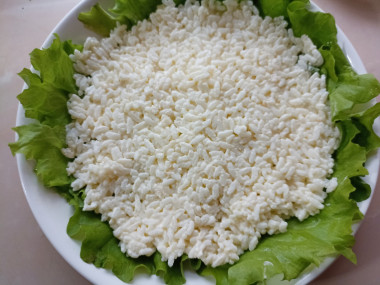 На выбранное блюдо выложите промытые и обсушенные листья салата. Листья следует выкладывать по одному, чтобы салат потом было удобно подавать вместе с листьями. Отварной рис смешайте с майонезом и выложите первым слоем на листья салата. Если при варке рис не солился, то по вкусу, его следует подсолить.