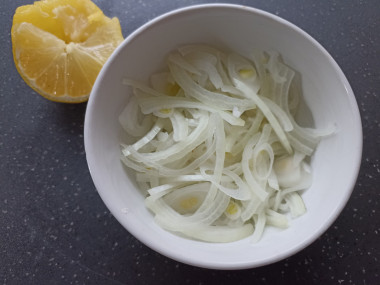 Третьим слоем выложите замаринованный лук, слив предварительно с него лимонный сок. Промажьте и этот слой небольшим количеством майонеза.