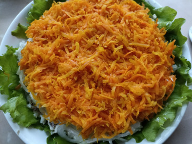 Следующим слоем выложите обжаренную морковь, слив с неё лишнее масло. Промажьте слой с морковью небольшим количеством майонеза. Также по вкусу морковь можно подсолить и поперчить.