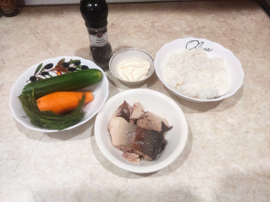 Рис я предварительно отварила, горбушу размяла вилкой. Огурец порезала соломкой. Лук порезала полукольцами и замариновала в лимонном соке. Морковь натерла на мелкой тёрке и обжарила на сковороде.