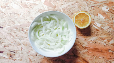 Лук очистите от шелухи и нарежьте полукольцами. Сложите лук в миску и залейте лимонным соком, добавьте перец по вкусу. Оставьте лук мариноваться на несколько минут. Огурцы помойте и нарежьте соломкой. Зелень укропа промойте, обсушите и мелко нарежьте. Смешайте нарезанные огурцы с нарезанной зеленью.