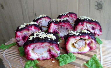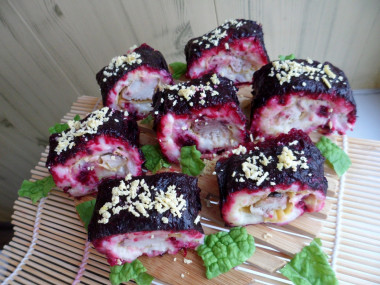 Первый раз делала роллы селедка под шубой, да и вообще первый раз делала роллы. Очень понравилось как красиво и оригинально выглядит блюдо у автора и захотелось повторить. У меня, конечно, так красиво не получилось, но зато вышло очень вкусно! Буду готовить по этому рецепту ещё и надеюсь будет получаться аккуратнее. Спасибо за рецепт!