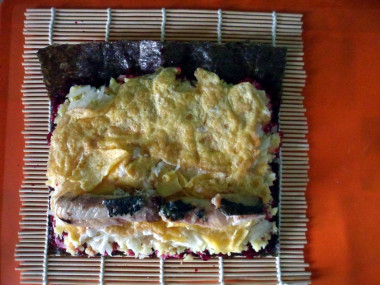 Филе сельди выложите вдоль длинного края нори, закрытого свеклой, отступив приблизительно 0,5 см. Теперь при помощи циновки сверните ролл, прижимая и придавая ему форму при каждом повороте.