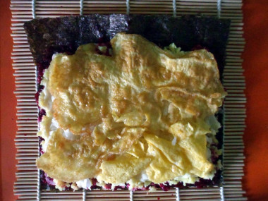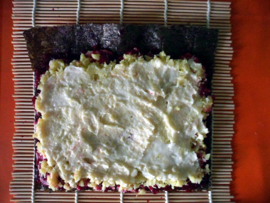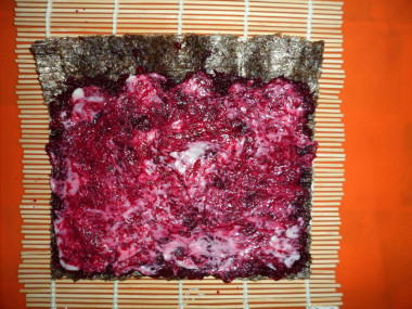 Пришло время к самому главному – формированию самих роллов. Положите лист нори на циновку гладкой стороной вниз, шероховатой стороной вверх. Выложите часть свеклы на лист нори (примерно 3 мм.), разровняйте ее таким образом, чтобы по длинному краю осталось пустое место (без свеклы) шириной в 1 см. Слой свеклы промажьте тонким слоем майонеза.