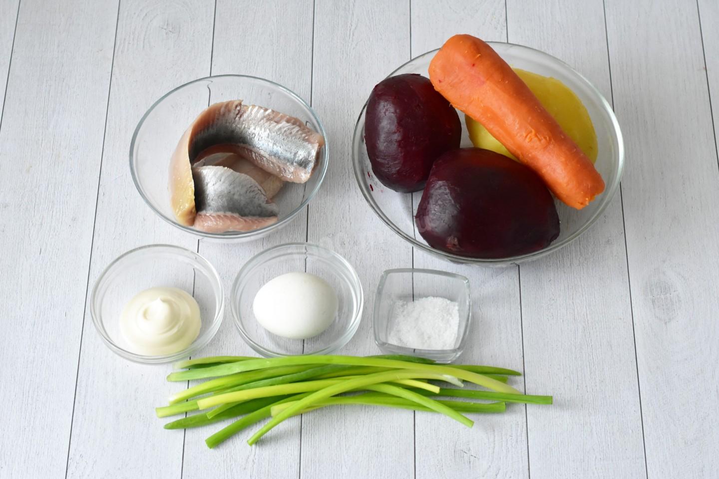 Для начала подготовьте необходимые ингредиенты. Свеклу можете не отваривать, а запечь в духовке. В магазинах продается уже готовая отварная свекла в вакуумной упаковке. Использование магазинной свеклы сэкономит вам время на готовку. Майонез можно сделать самостоятельно. Рецепты домашнего майонеза вы найдёте после последнего шага. Зеленый лук вымойте и обсушите.
