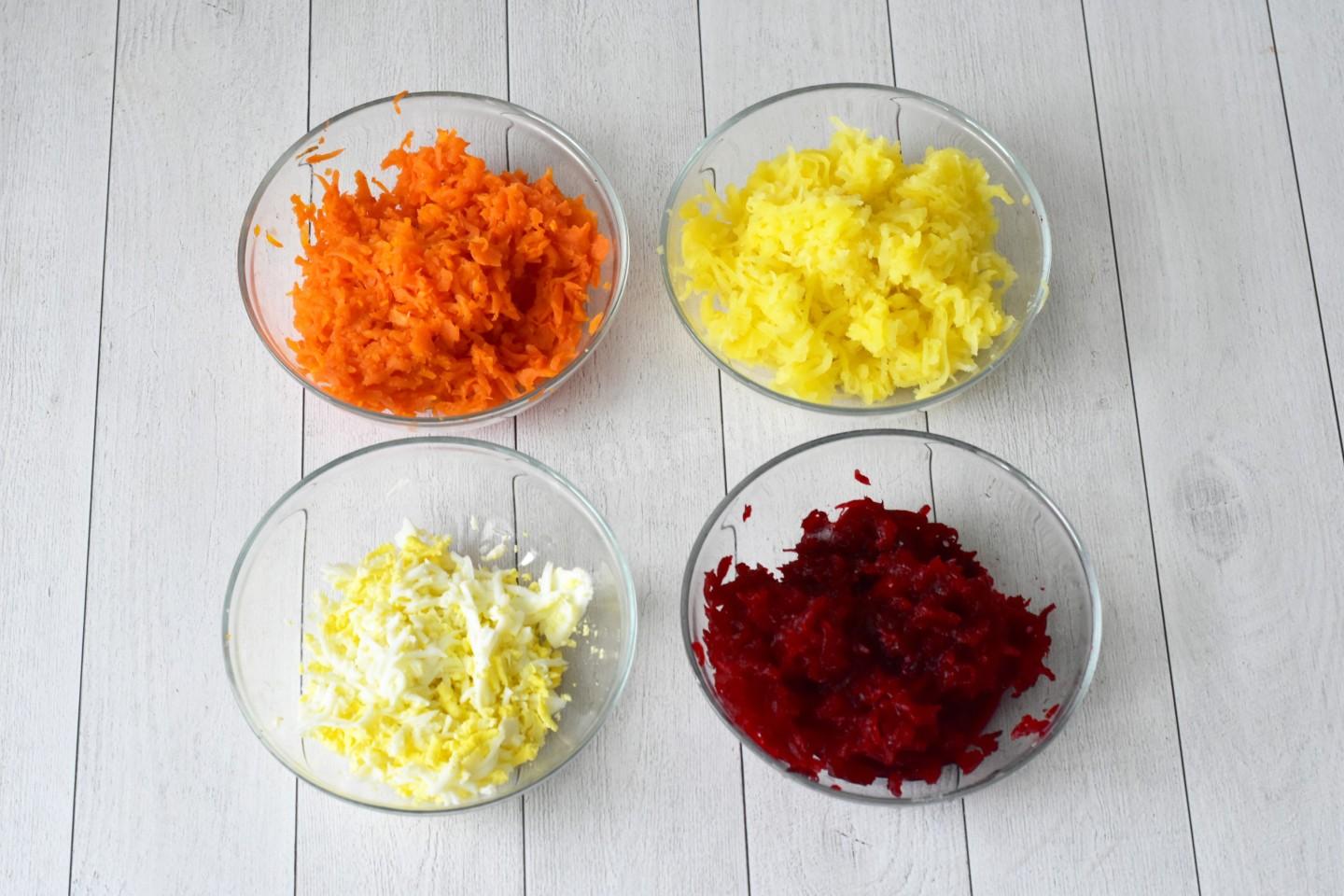Картофель, морковь и свеклу отварите в кипящей подсоленной воде в кожуре до готовности. Все овощи охладите, очистите. Одну свеклу, морковь и картофель натрите на крупной или средней терке. Если свекла водянистая, отожмите ее. О выборе сорта картофеля и кастрюли для варки читайте под шагами. Яйца сварите вкрутую, охладите и очистите. Натрите на крупной терке. Подробнее о нюансах приготовления свеклы и яиц читайте в конце рецепта.