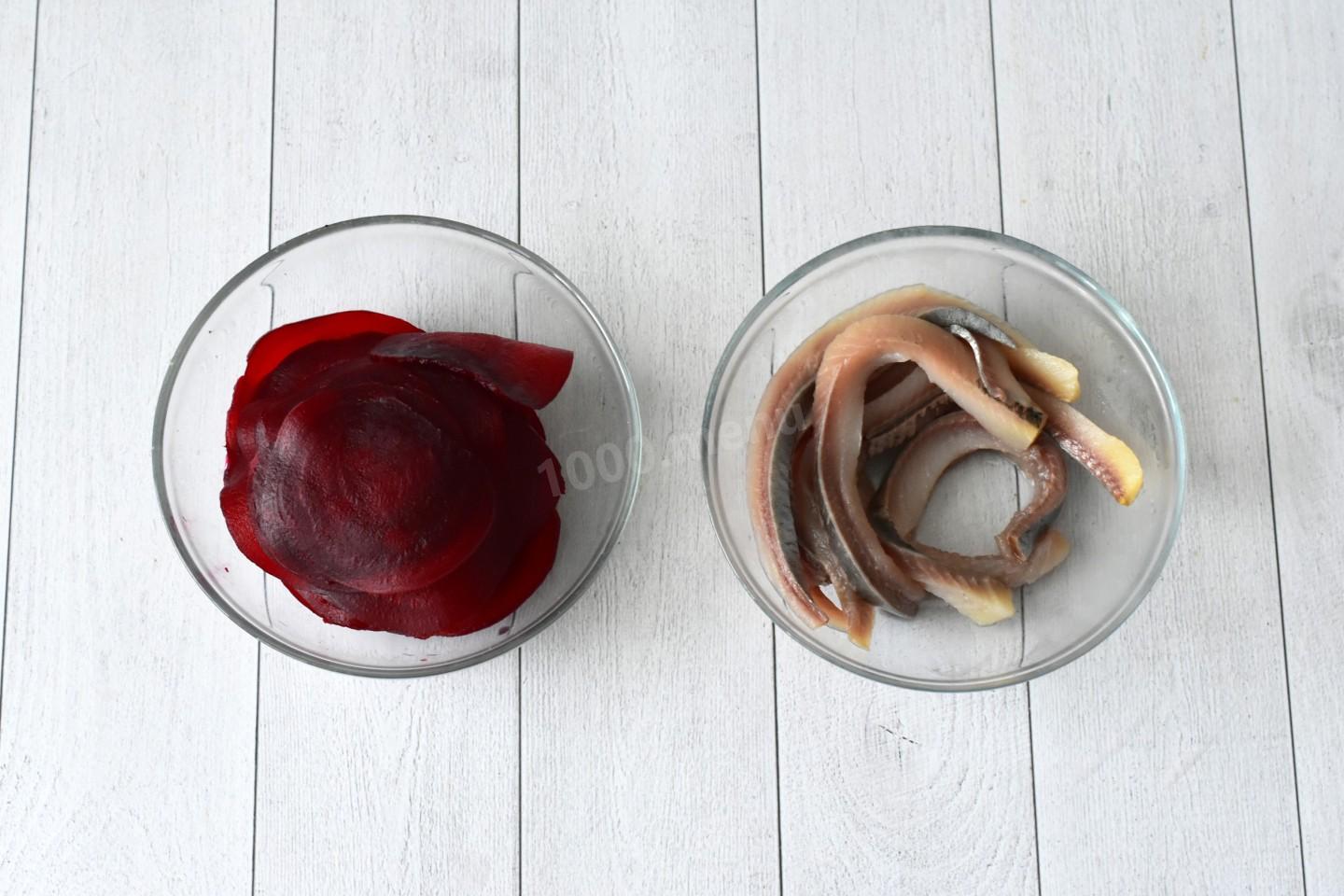 Шаг 3. Как нарезать вторую свеклу и филе сельди?