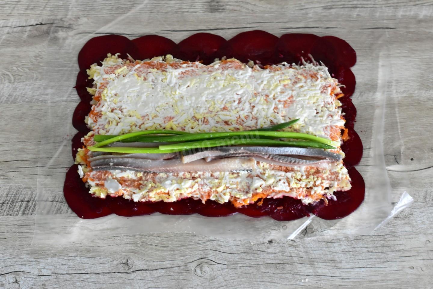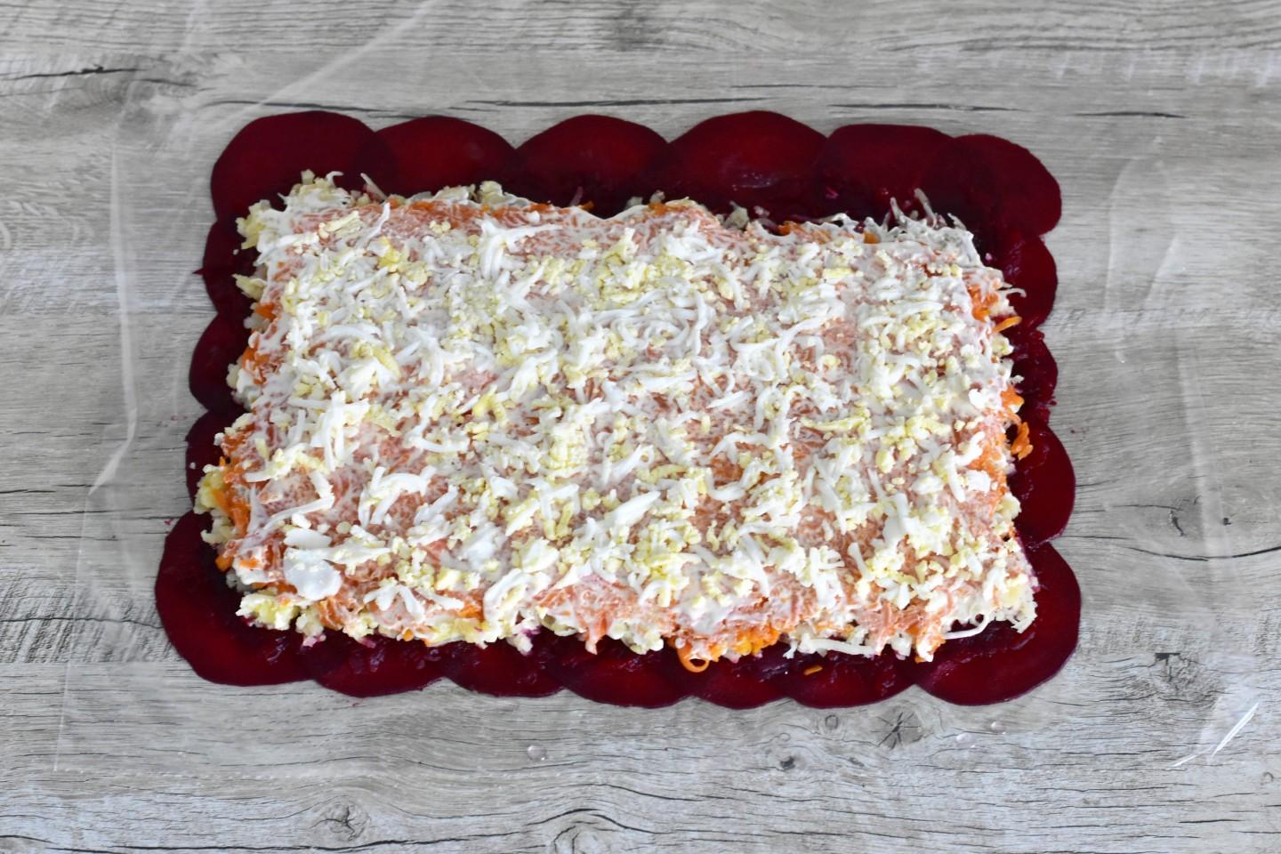 На пищевую пленку выложите слайсы свеклы внахлест в виде ровного прямоугольника. Сверху равномерно распределите тертую свеклу. Поверх свеклы выложите слоями, промазывая каждый майонезом и слегка присаливая, картофель, морковь и яйца.
