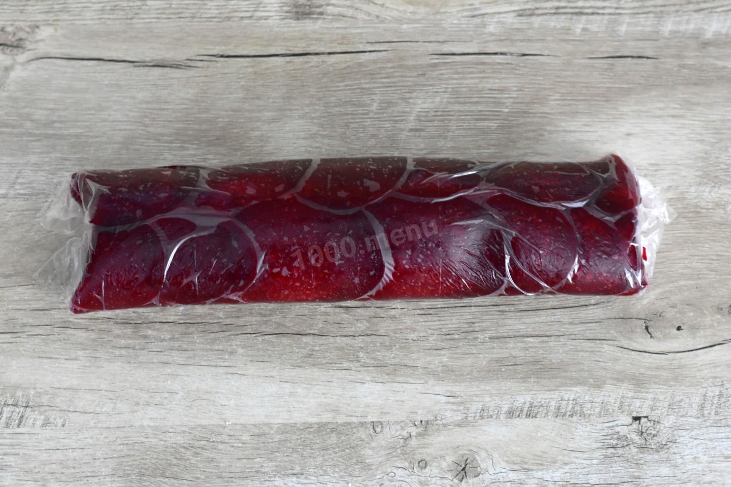 Подворачивая края пищевой пленки, сверните пласт плотным рулетом. Заверните рулет в пищевую пленку и уберите на 2 часа в холодильник для пропитки.