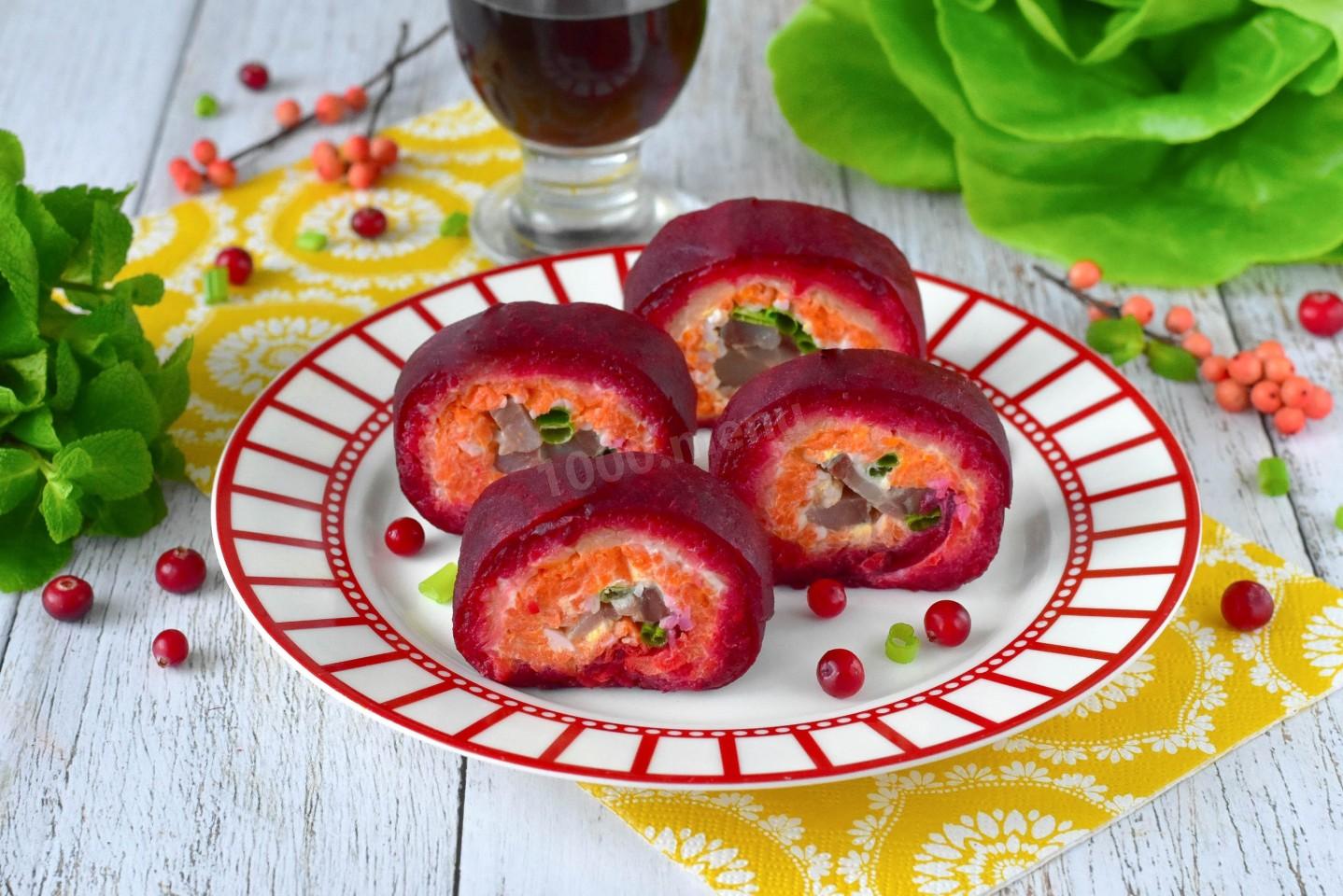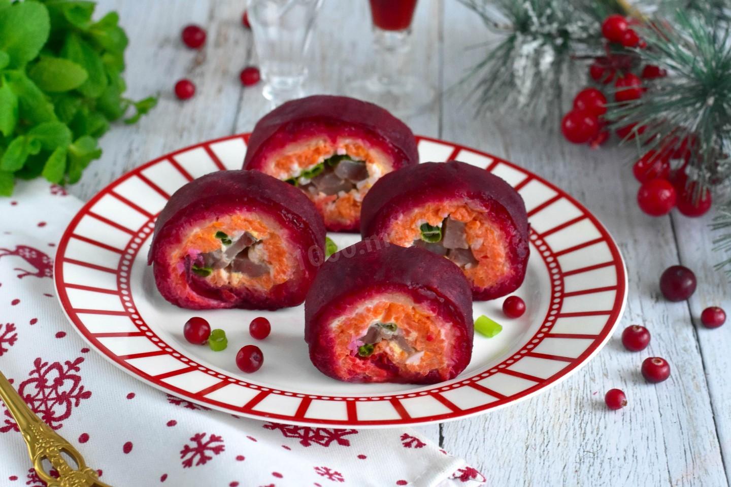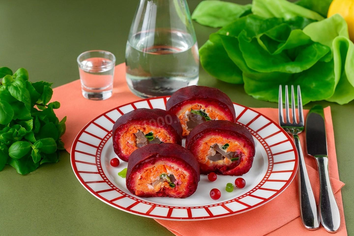 Если очень тонко нарезать свеклу для внешнего слоя, рулет получится более нежным и изящным.