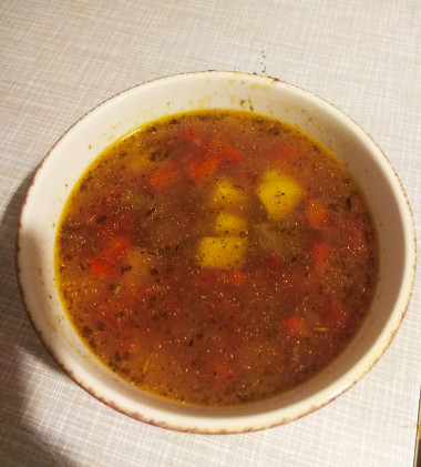 Вкусный суп получился. Спасибо за рецепт. У меня, правда, сушёная зелень вместо свежей и столовая чечевица вместо красной.