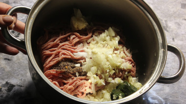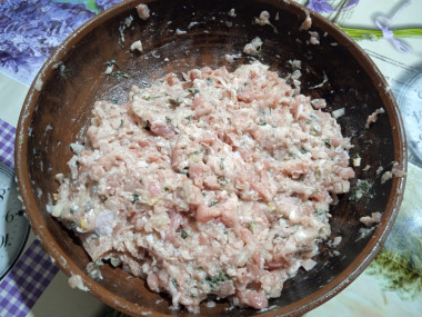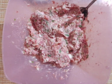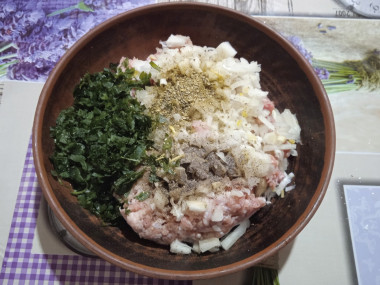 Фарш взяла свиной и так как он достаточно жирный сливочное масло добавлять не стала. Порезала мелко луковицу, петрушку и положила всё в фарш. Посолила, поперчила добавила хмели сунели вымесила и отбила фарш.