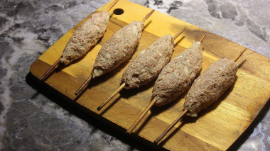 Сделала люля кебаб на сковороде в домашних условиях из фарша по этому рецепту. Использовала свиной фарш для приготовления кебаба. Репчатый лук мелко порезала, также измельчила зелень. Смешала фарш с луком, чесноком и зеленью. Добавила соль, перец и хмели-сунели. Перемешала фарш и хорошо отбила его об миску. На влажные деревянные шпажки нанизала полученную массу. Обжарила кебабы на сковороде на масле с двух сторон до румяности. Шикарное блюдо получилось. Люля кебабы вышли румяными, сочными, ароматными и очень вкусными. Подавала на ужин с картофельным пюре и овощным салатом. Муж был в восторге. Блюдо простое и быстрое в приготовлении, а результат впечатляет. Превосходный рецепт! Обязательно ещё буду готовить кебабы и всем советую. Благодарю автора 😊