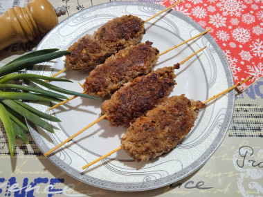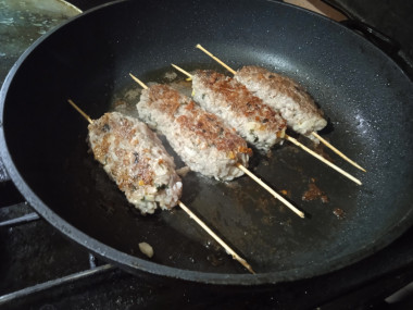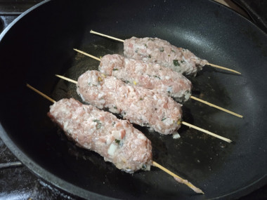 Понравилась рекомендация замочить предварительно шпажки в воде. На мокрых шпажках сформировала люля кебаб. Первый начал немного прилипать к сковороде, поэтому последующие слегка припудрила кукурузной мукой и они не прилипали.
