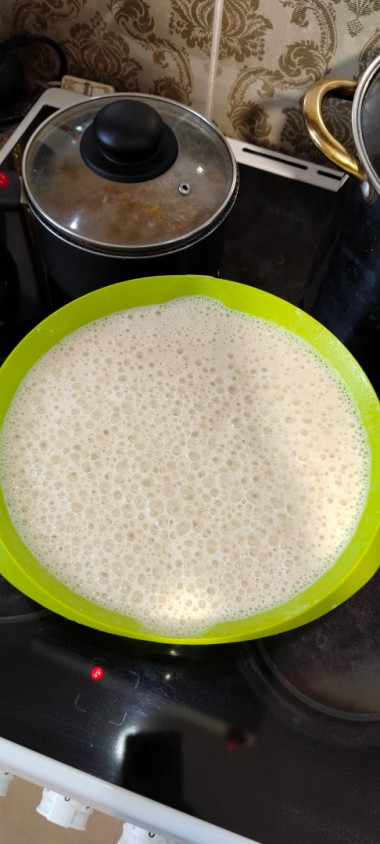 Подошедшее тесто должно хорошо подняться и покрыться пузыриками. Перемешайте его. Можно приступать к жарке блинчиков.