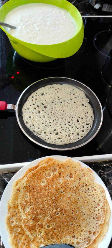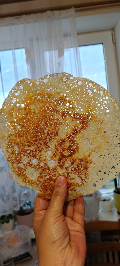 Благодарю за рецепт. Блинчики получились воздушными, с дырочками и очень вкусными. Тесто постояло чуть подольше, чтобы получилось немного с кислинкой. Жарила без масла, отлично зарумянились! К столу подавала со сгущенкой и яблочным конфитюром, детям очень понравились эти блинчики. Просят на выходных повторить и сделать порцию побольше.