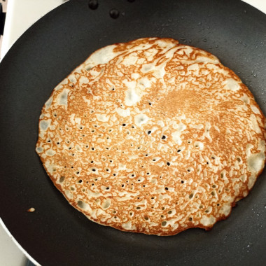 Переверните блин на другую сторону и жарьте до готовности. Вторая сторона жарится всегда быстрее. Масло на сковороду больше не наливайте. У меня сковорода диаметром 20 сантиметров, вышло 15 блинчиков. Но их количество также зависит от толщины - я жарила тонкие. Приятного аппетита!