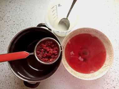 Я люблю разные виды киселя: жидкий, густой, кислый, сладкий. На этот раз сварила клюквенный кисель. Ягоды у меня были замороженные. Залила их горячей водой для оттаивания, а вот измельчала непосредственно в воде толкушкой. Иначе сок сильно брызгается). Отжимки решила убрать из отвара, предварительно отжав их. Крахмал использовала картофельный, но взяла его в два раза больше. Кисель получился в меру густым, текучим. Он очень вкусный! Мне понравилось терпкое с кислинкой послевкусие. А еще кисель получился красивого ярко розового цвета.