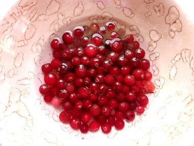 Чтобы при разморозке ягод в них сохранилось максимум витаминов, замороженные ягоды обдайте горячей водой и переходим к их измельчению.