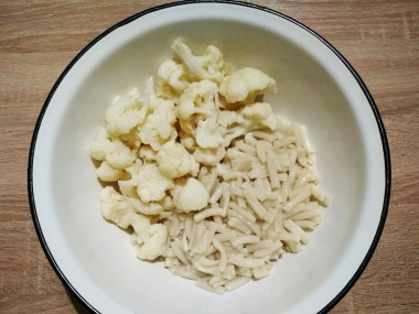 В удобной емкости соедините макароны и цветную капусту.