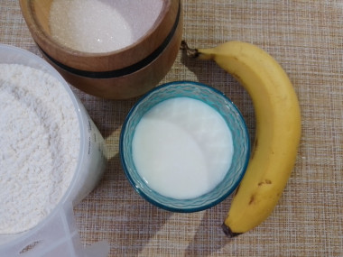 Подготовить ингредиенты. Чтобы приготовить дрожжевые булочки с бананом, нам понадобится: мука; сахар; молоко; спелый ароматный крупный банан; свежие или сухие дрожжи; растительное масло и соль.